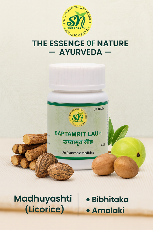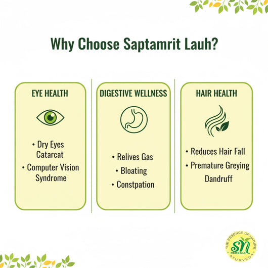 सप्तामृत लौह विभिन्न जड़ी-बूटियों से बना है जो सभी आयु वर्ग के रोगियों के लिए फायदेमंद है। एक गोली लेने से आंखों की लालिमा, जलन और खुजली को कम करने में मदद मिल सकती है।